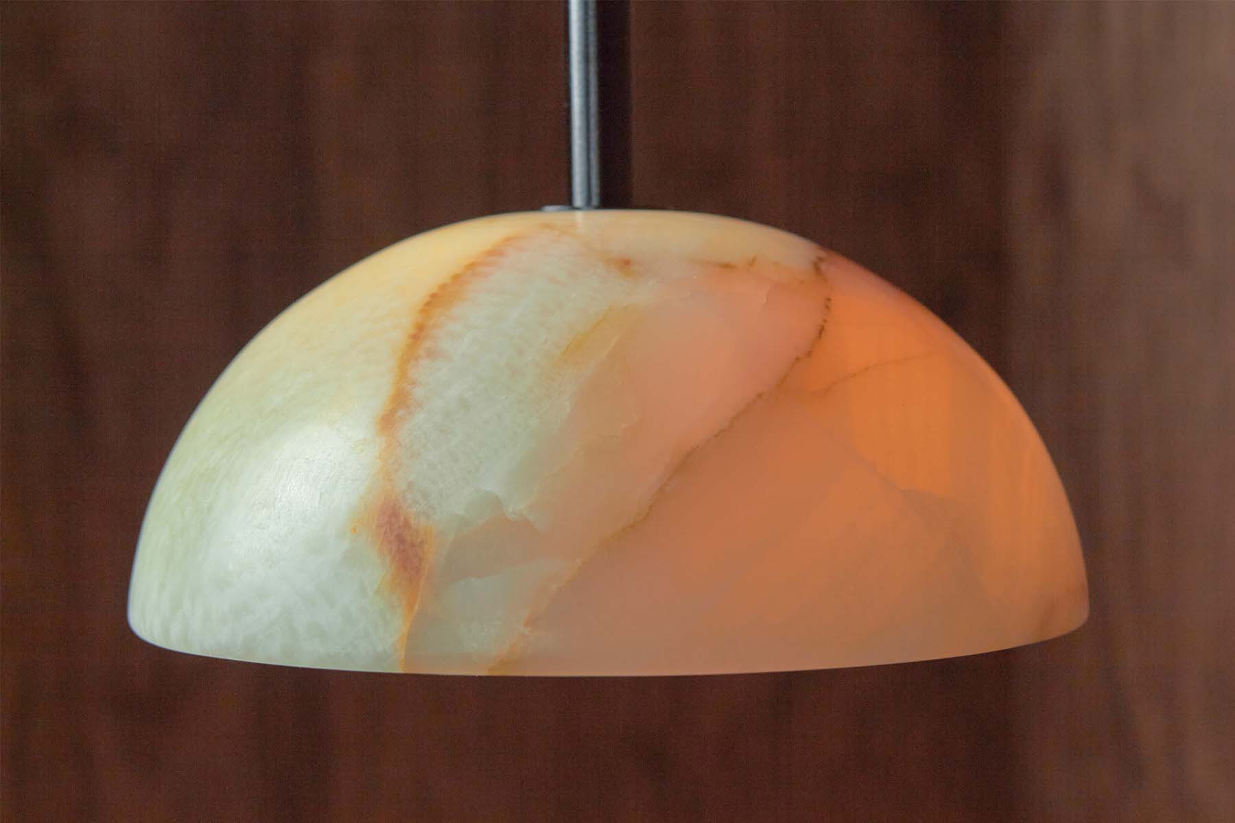 The Aurelia Pendant Light is available in either white or jade stone. This simple yet intricate shade produces both direct and diffused illumination through its translucent stone. The Aurelia Pendant forms part of a new celestial range of residential and commericial lighting, combining contemporary and classic parts through a chandelier-style presence.